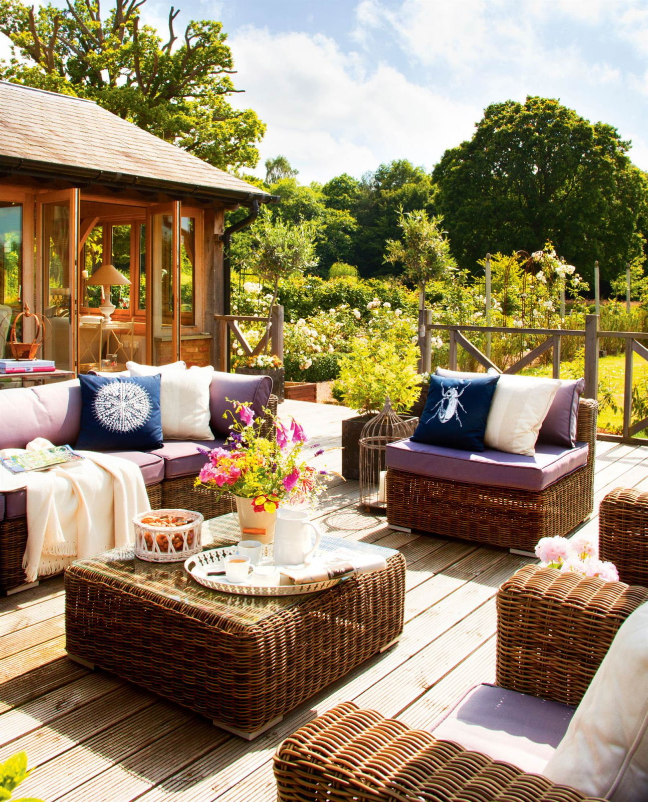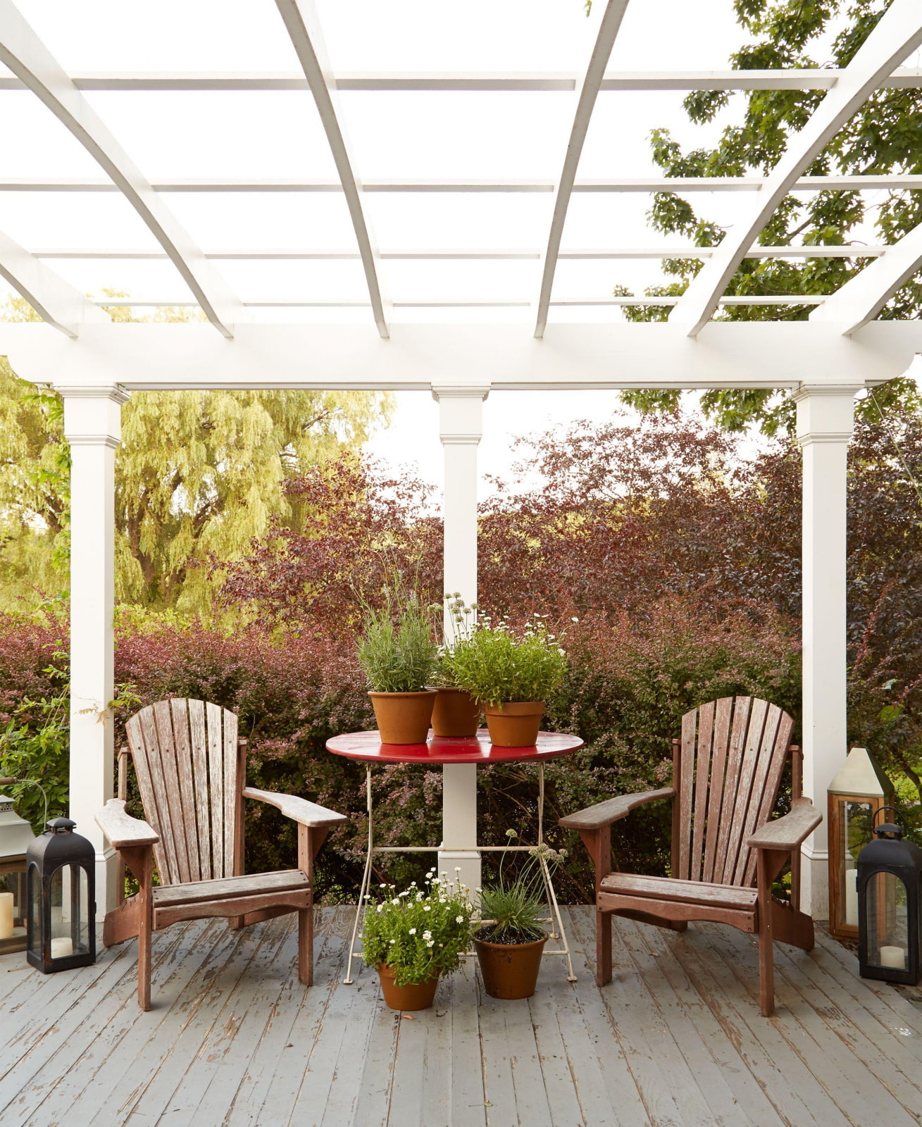 Advice! This type of patio looks most harmonious in the French Provence style with white wrought-iron furniture surrounded by perennial flowers.
