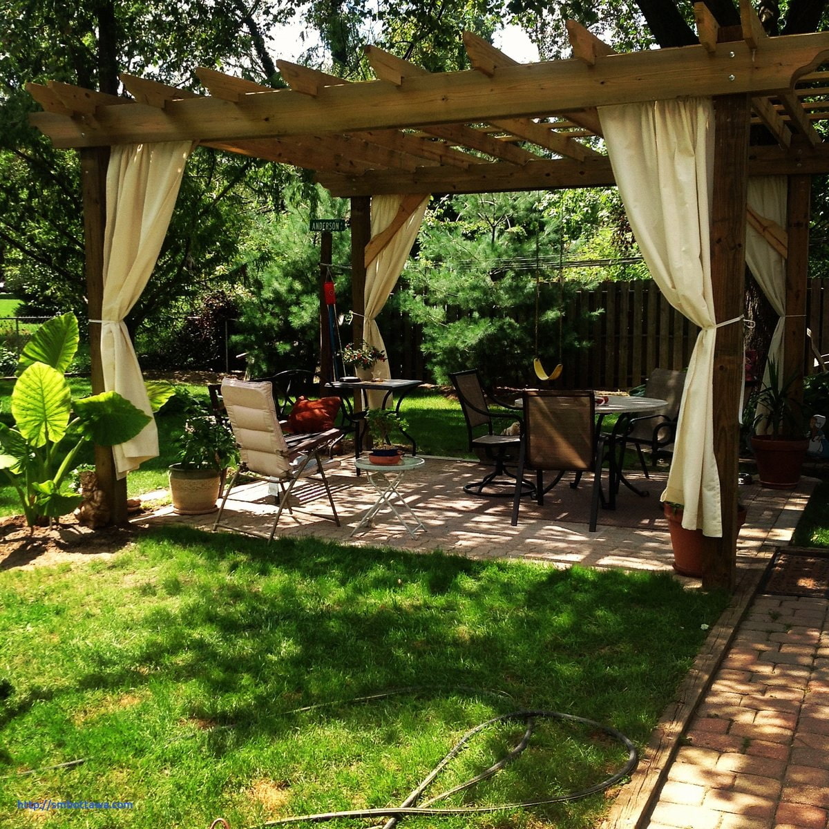 In the photo there is an open recreation area under pergola