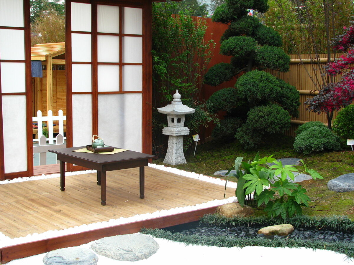Registration in japanese style minimalist, you need to place bonsai in pots, Buddhist figurines, fountains or ponds with aquatic plants.