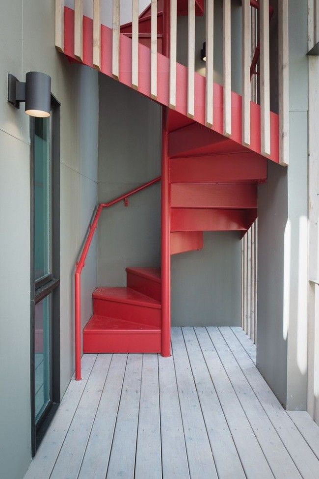 - Scandinavian style. The standard combination is red and white. Racks made of white plastic, metal, wood, stairs and handrail - natural wood.