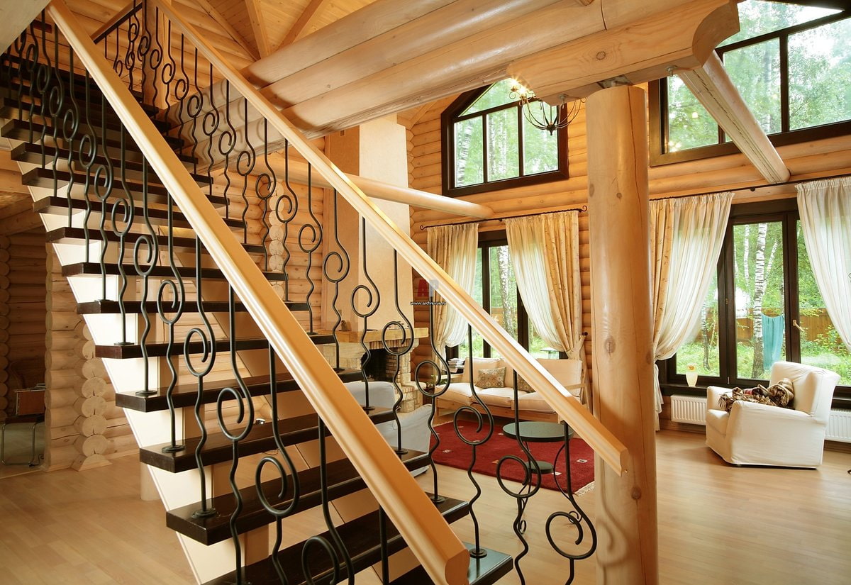 The forging technique creates a sophisticated structure that looks lighter than bulky wooden railings. A staircase framed with such supports looks airy and does not hide the space. The main thing is not to overdo it with the design.