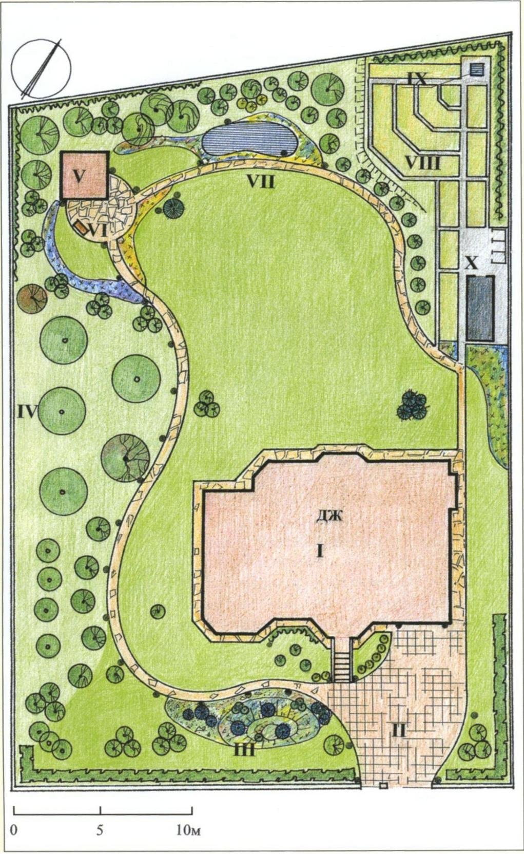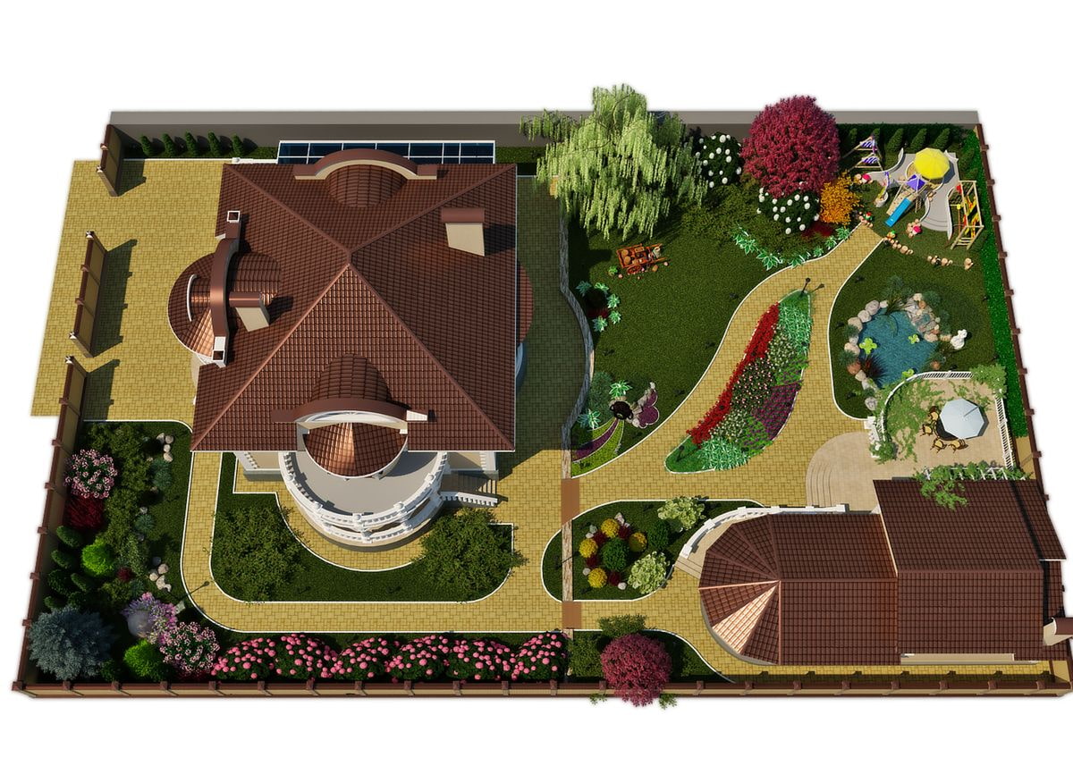 - The layout of the garden plot assumes a rational distribution of functional areas. 30% of the land plot is allocated for a residential building and outbuildings, ~ 20% is occupied by a recreation area with barbecue area, a playground, the remaining 50% are cultivated for beds, trees or shrubs are planted.