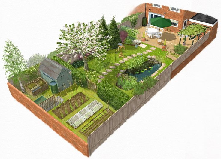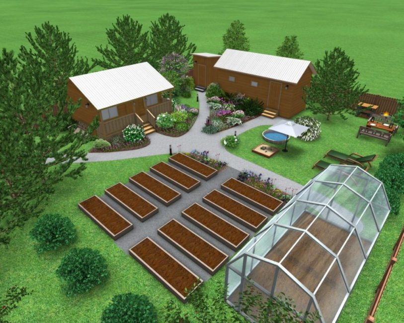 In addition to buildings, do not forget about a place for a garden and a vegetable garden: in this part there are fruit trees and shrubs, beds, flower beds, greenhouses and garden tools... Use the area as efficiently as possible: to save space in a small area, for example, you can build racks and use the system vertical cultivation.