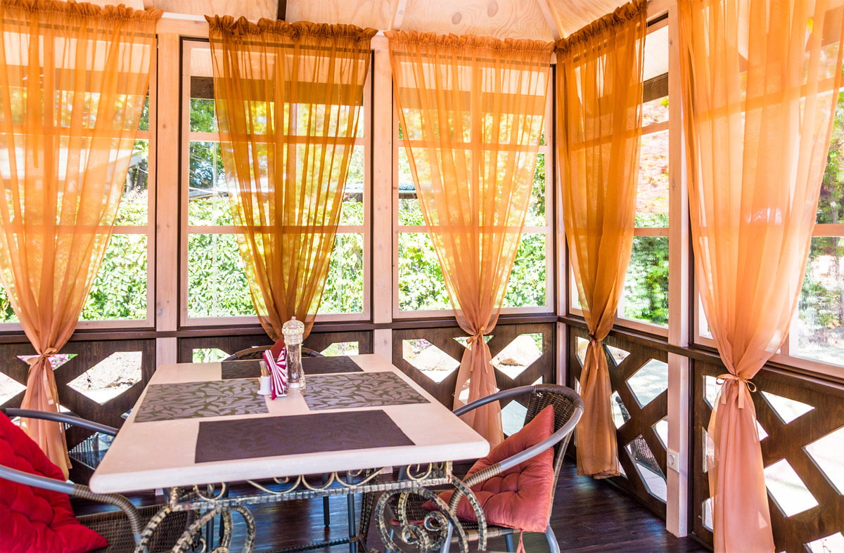 Plain curtains or curtains with various prints fit perfectly into the surrounding landscape design, create a mood and make the room bright. Lightweight curtains are especially suitable for decorating a wooden gazebo.
