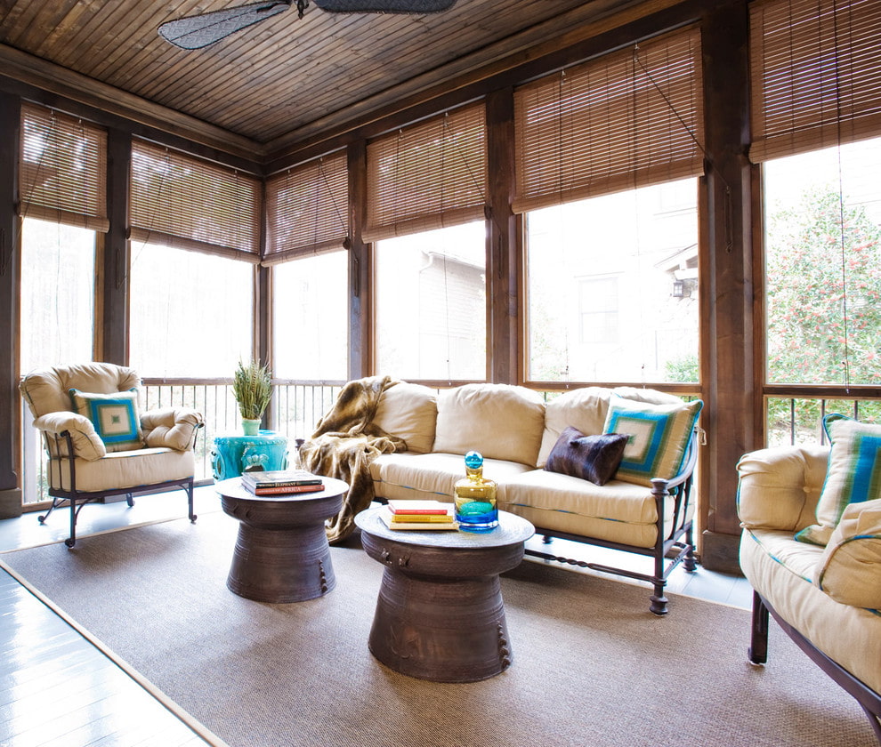 In the photo there is a veranda with street shades of a light shade.