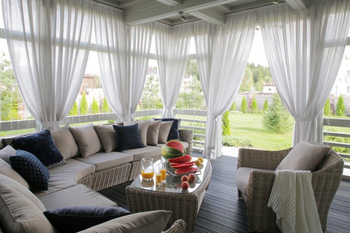 In the photo, light-colored acrylic curtains on the terrace.