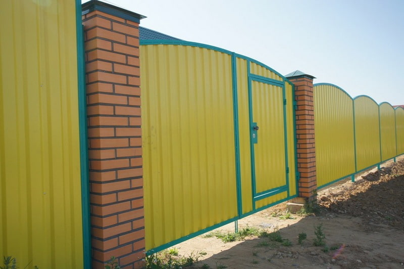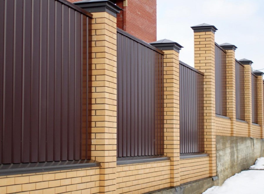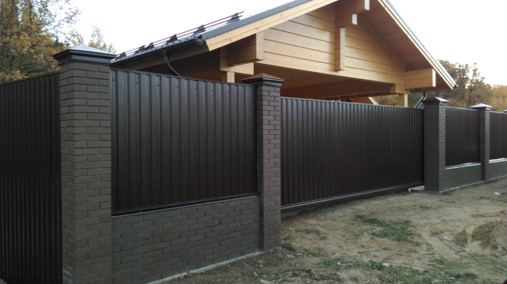 Such a fence has become widespread due to its noble appearance. Between the brick columns there are sections of corrugated board, which is attached to the logs from a profile pipe or a corner. If the spans between the support pillars are large enough, it becomes necessary to install additional lags, which are installed from the back side.