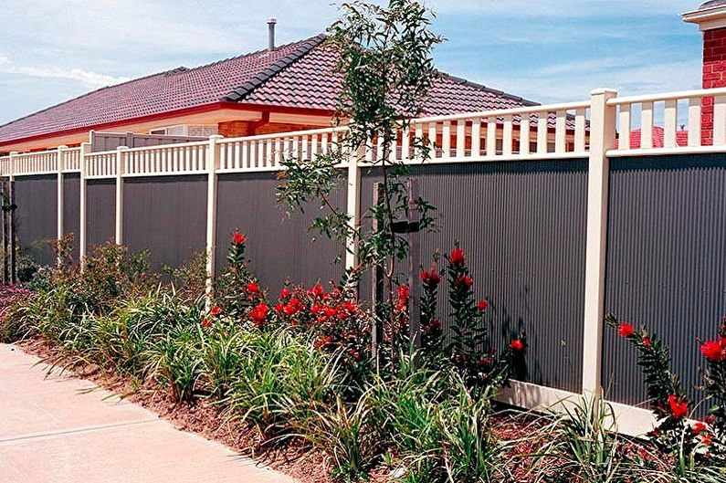 A laconic fence made of corrugated board can be easily turned into a source of pride for the owner of the house. The design of the top edge deserves special attention. Trimming metal canvases can be done in the form of an arc, this simple solution will make the fence more attractive. Decorative grilles or metal canopies can be placed over the frames with profiled sheets. Lanterns or candlesticks placed on a corrugated fence from the side of the site will also serve as its decoration.