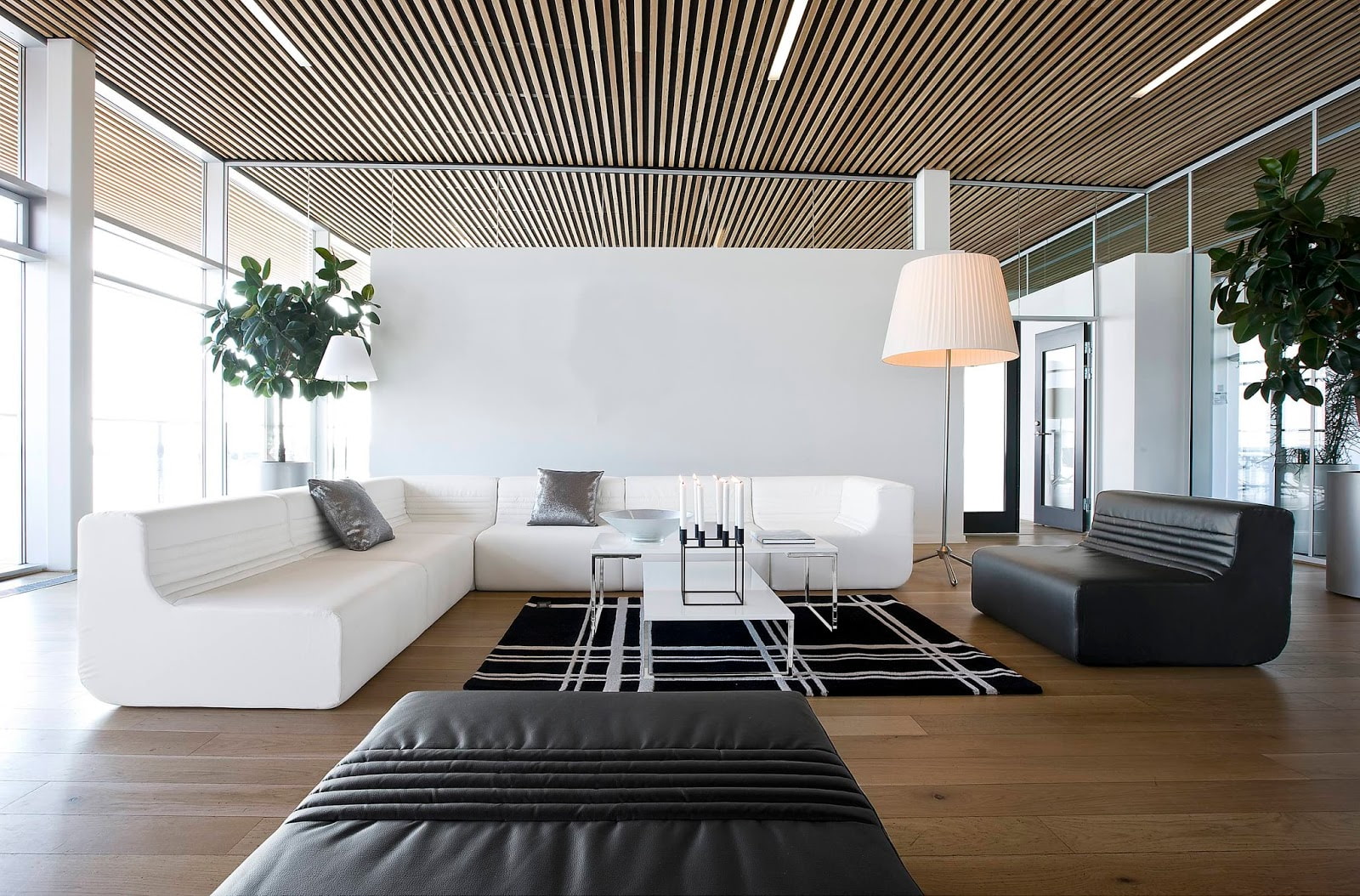 Sur la photo, un salon de style moderne avec un plafond en lattes de bois.