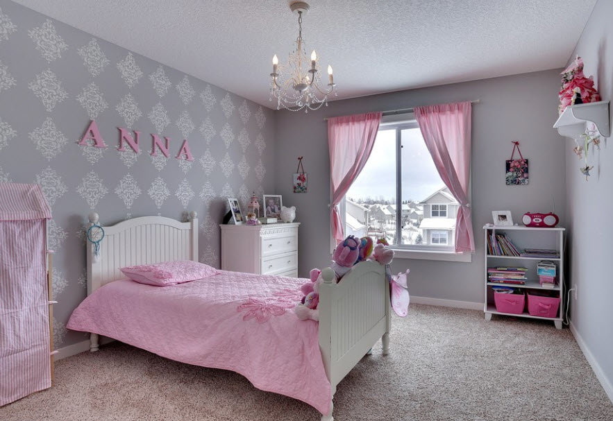 Le rose sur fond gris créera une atmosphère romantique et légèrement frivole dans la pièce. Une telle solution coloristique convient à la conception d'un intérieur féminin ou à la conception d'une chambre d'enfant pour une fille.