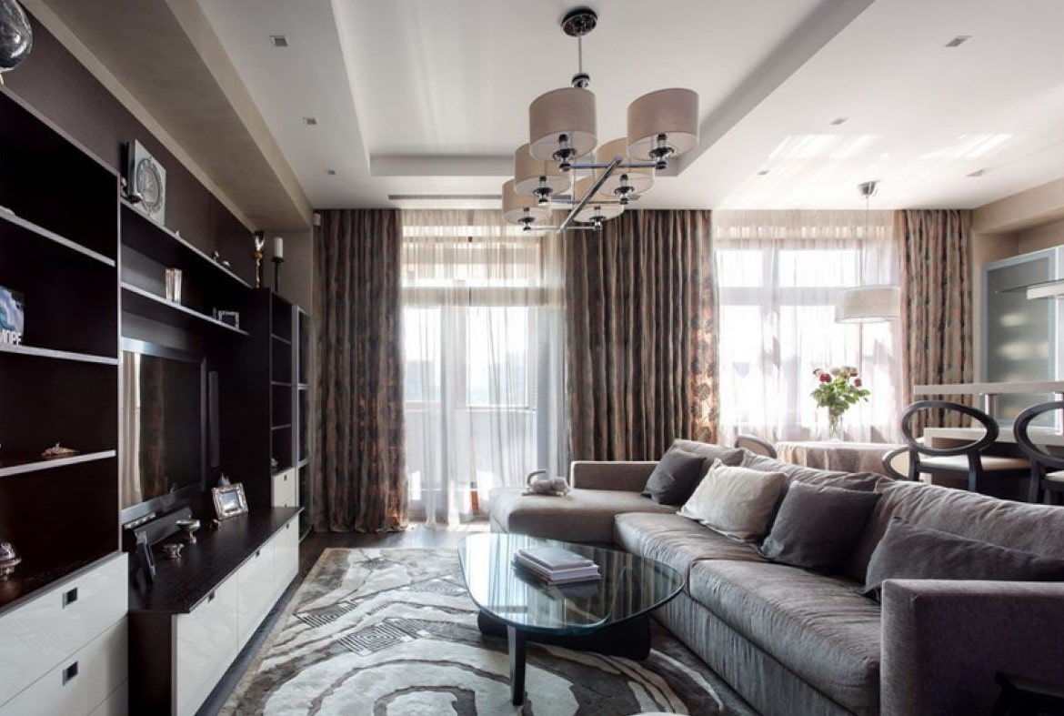 Dans un petit salon, une excellente solution serait de décorer dans des couleurs chaudes, et pour un hall spacieux, des tons froids conviennent. Une palette monochrome ajoutera de la complexité au décor. L'intérieur peut être complété par des accents lumineux tels que des rideaux, un canapé avec des coussins, des fauteuils et plus encore.