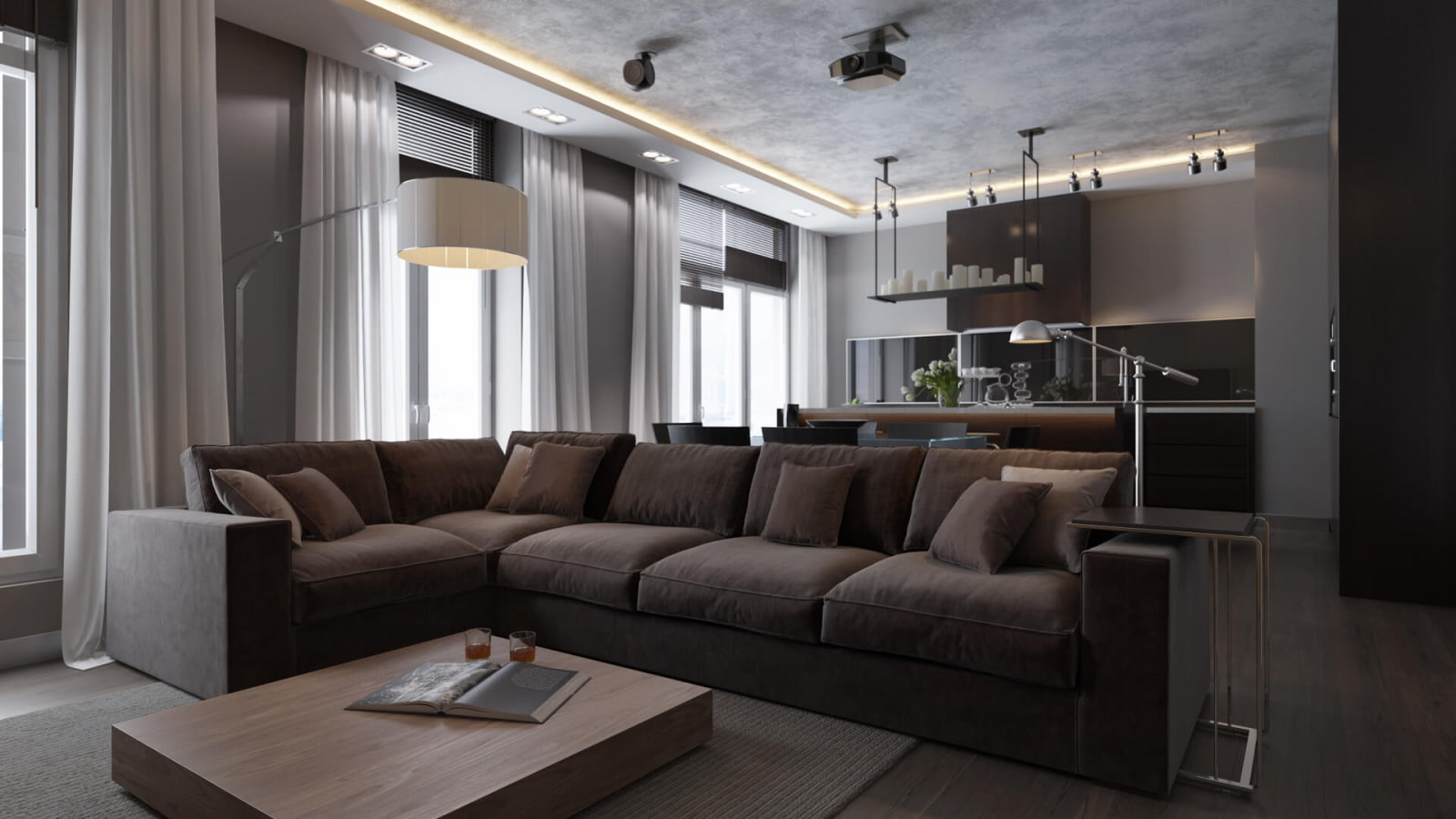 La photo montre une combinaison de couleurs gris-brun à l'intérieur d'une cuisine-salon moderne.