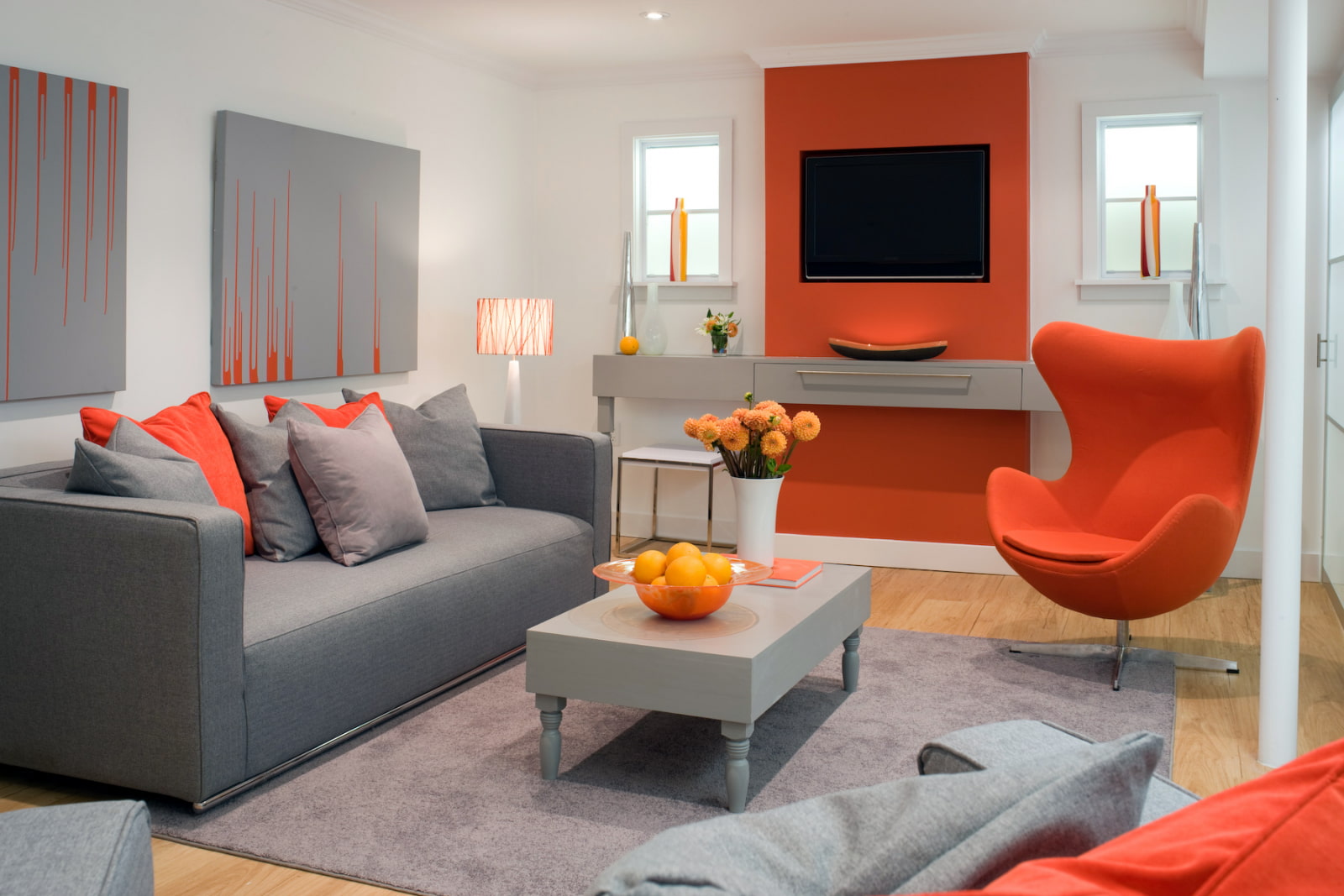 Une telle combinaison autonome est rarement complétée par des couleurs d'accent. Le gris équilibrera et calmera l'orange et rendra le design environnant équilibré et organique.