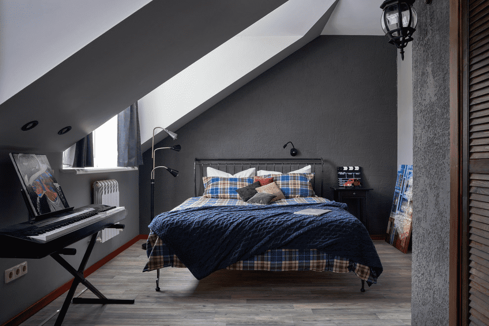 La photo montre l'intérieur d'une chambre d'adolescent dans le grenier, réalisé dans des tons gris.