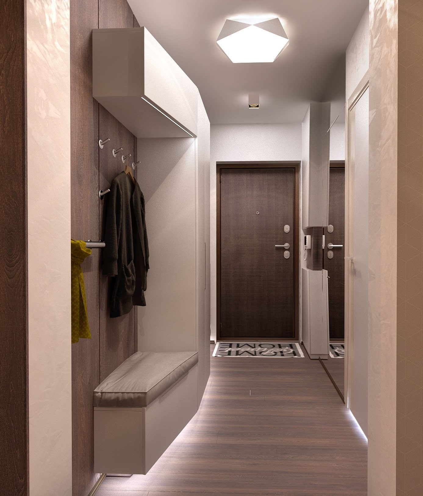 En raison du placement correct du couloir, il s'avère non seulement d'économiser de l'espace supplémentaire dans le couloir étroit, mais également de créer une atmosphère confortable et chaleureuse dans l'appartement.