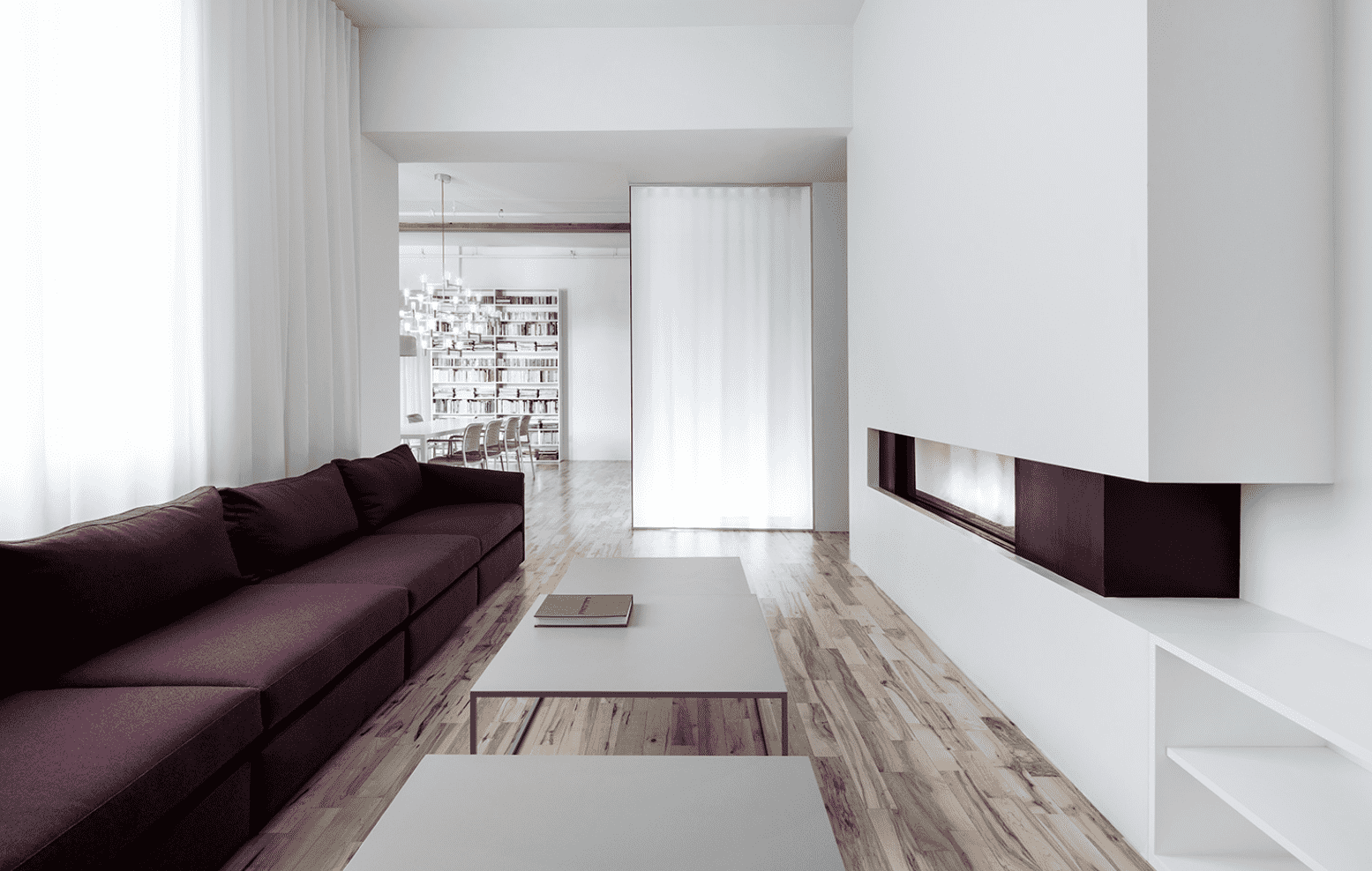 La photo montre un salon minimaliste avec une cheminée, décoré pour correspondre à la couleur des murs.