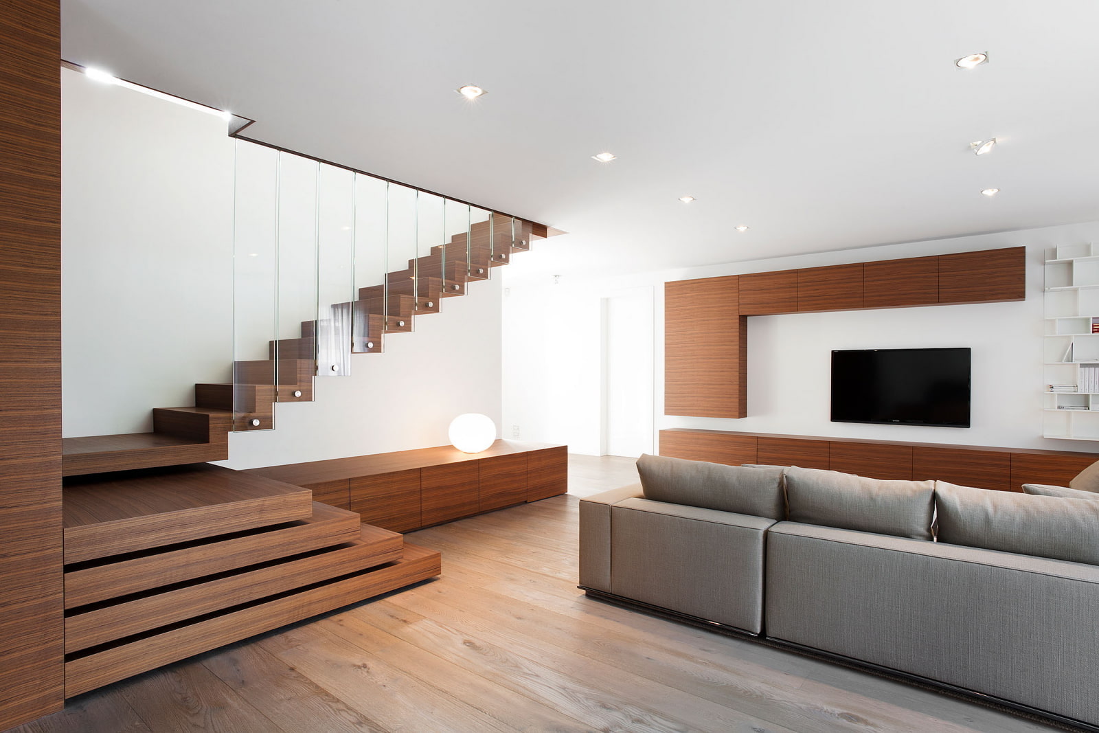 La photo montre l'intérieur d'un grand salon dans le style du minimalisme avec un escalier en bois.