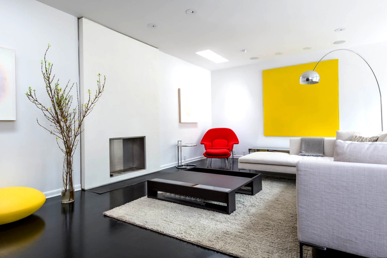 La photo montre l'intérieur d'un salon blanc dans un style minimaliste, complété par des détails d'accent.