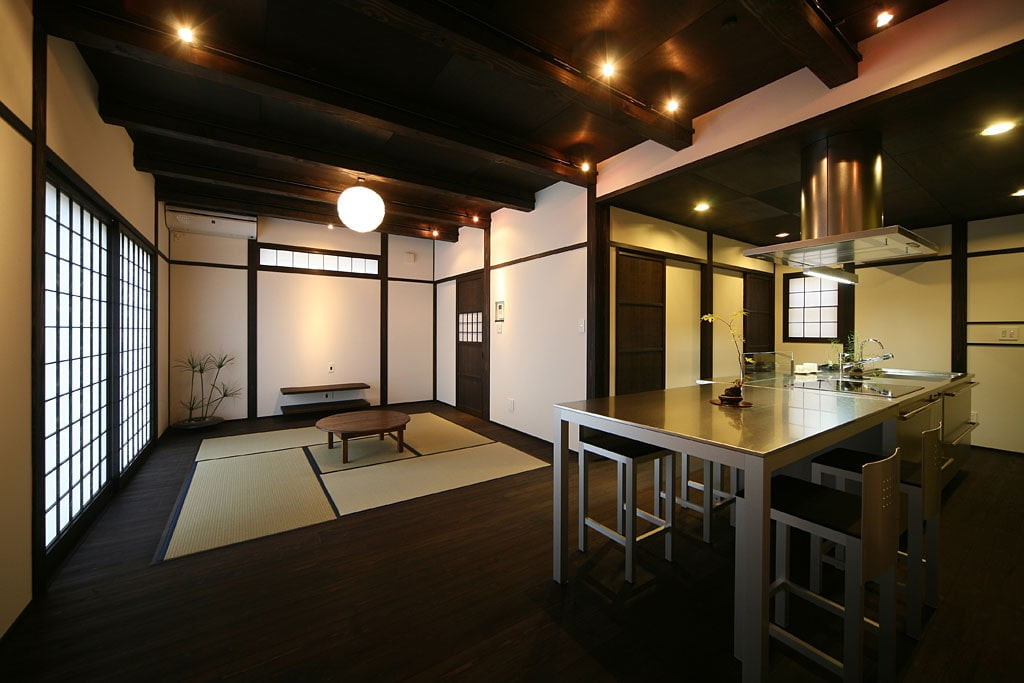 Sur la photo, il y a des plafonniers suspendus et un éclairage ponctuel à l'intérieur de la cuisine-salon de style japonais.