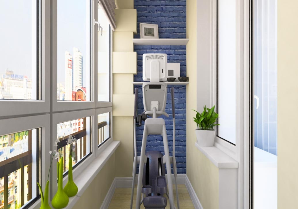 Balcon d'une superficie moyenne de 6 carrés, idéal pour se transformer en poste de travail avec un plateau de table. Dans une telle pièce, il convient d'installer un canapé compact, un réfrigérateur ou une armoire dans une niche.