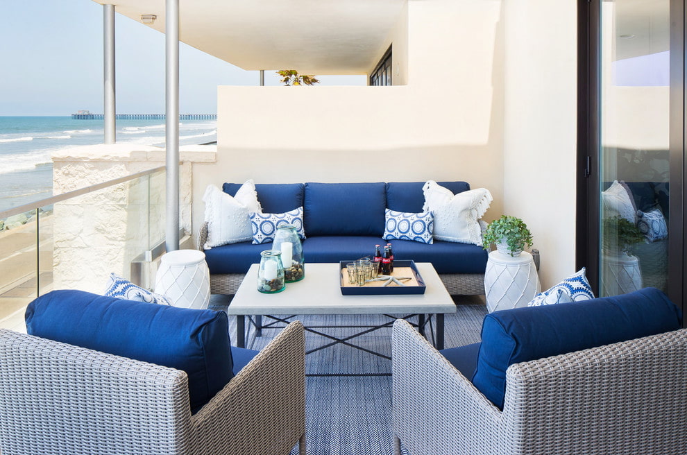 Tout d'abord, lors de l'équipement, tenez compte du changement des conditions météorologiques. Pour un balcon froid, choisissez des meubles en matériaux résistants à l'humidité et aux températures extrêmes. Les draps et les oreillers sont utilisés comme décor, qui peuvent être facilement retirés dans la maison par mauvais temps.
