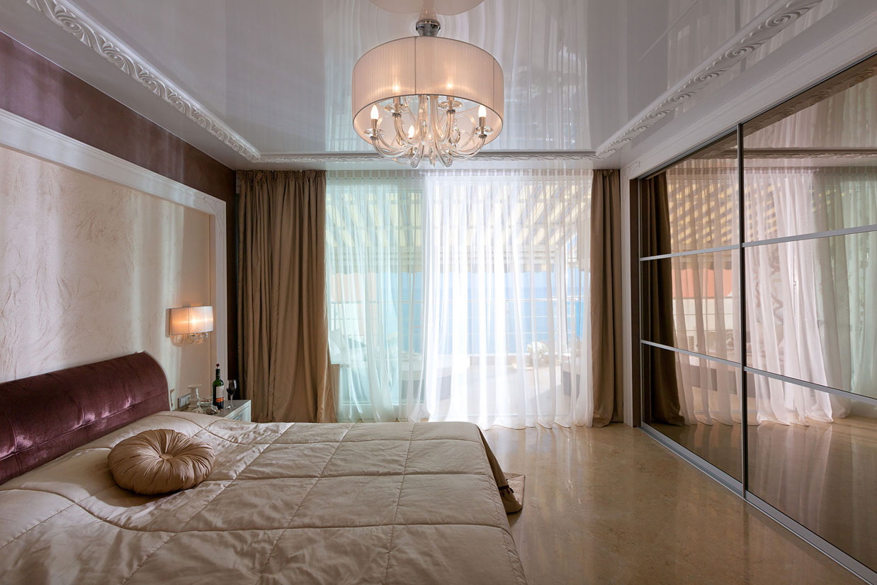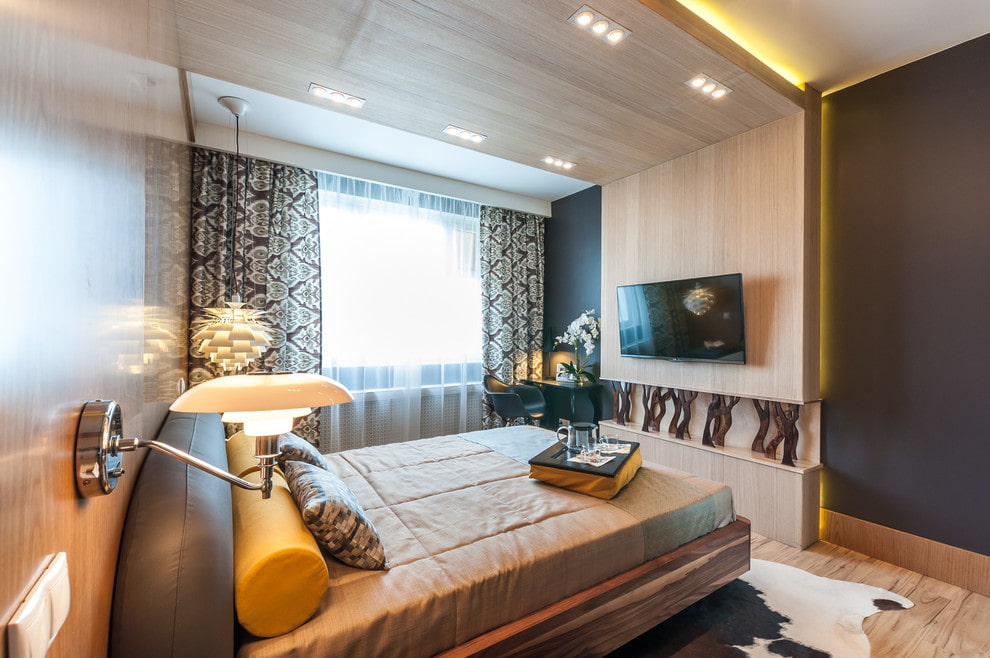 O teto do quarto, combinado com uma iluminação aconchegante, cria um interior confortável e elegante e uma atmosfera agradável. Seu design é um componente importante no design desta sala.