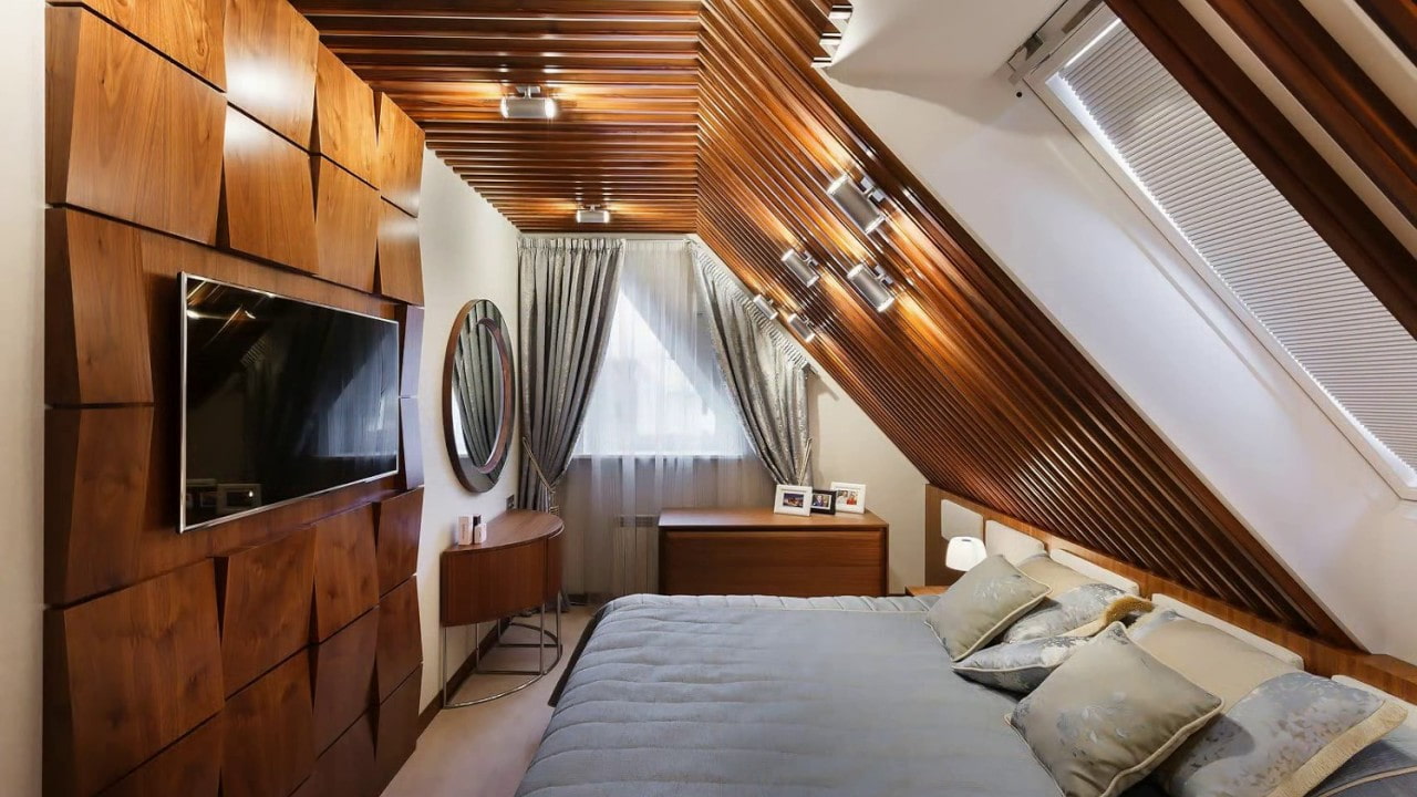 O tecto inclinado do sótão é muitas vezes recortado com produtos de gesso cartonado ou modelos de madeira, por exemplo, ripas, laminados, ripas ou painéis com imitação de barra. Tons dourados naturais claros ou quentes ficam melhor aqui.