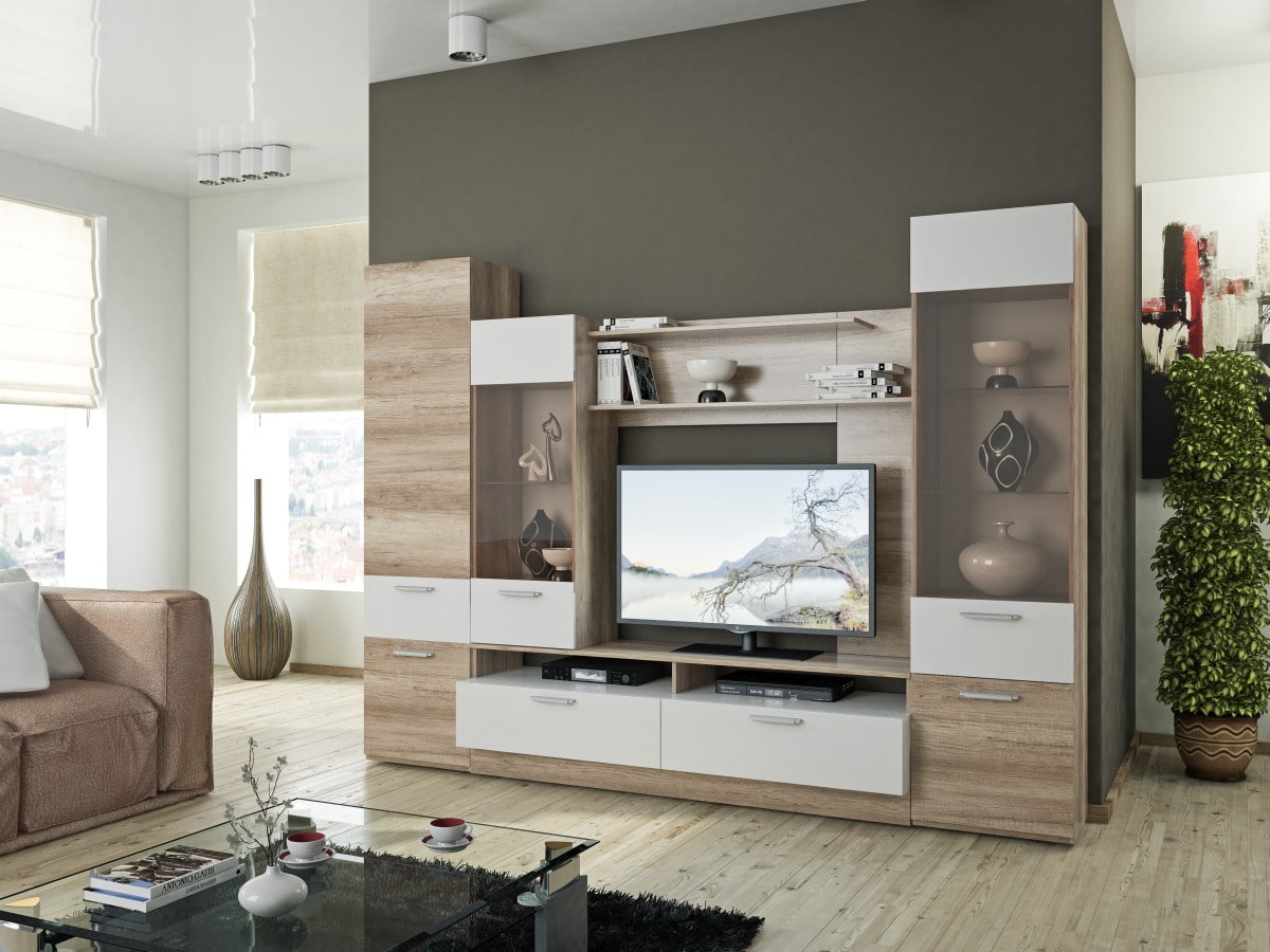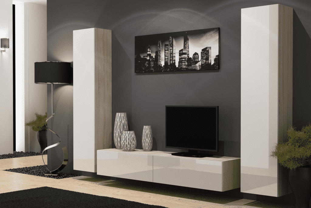 Bu tasarım kompakt parçalardan oluşur ve çeşitli küçük dolaplar, kalem kutuları veya duvara monte raflarla donatılabilir. Sürgülü duvar, büyük olmayan görünümü sayesinde hem küçük hem de daha geniş oturma odalarına mükemmel uyum sağlar.