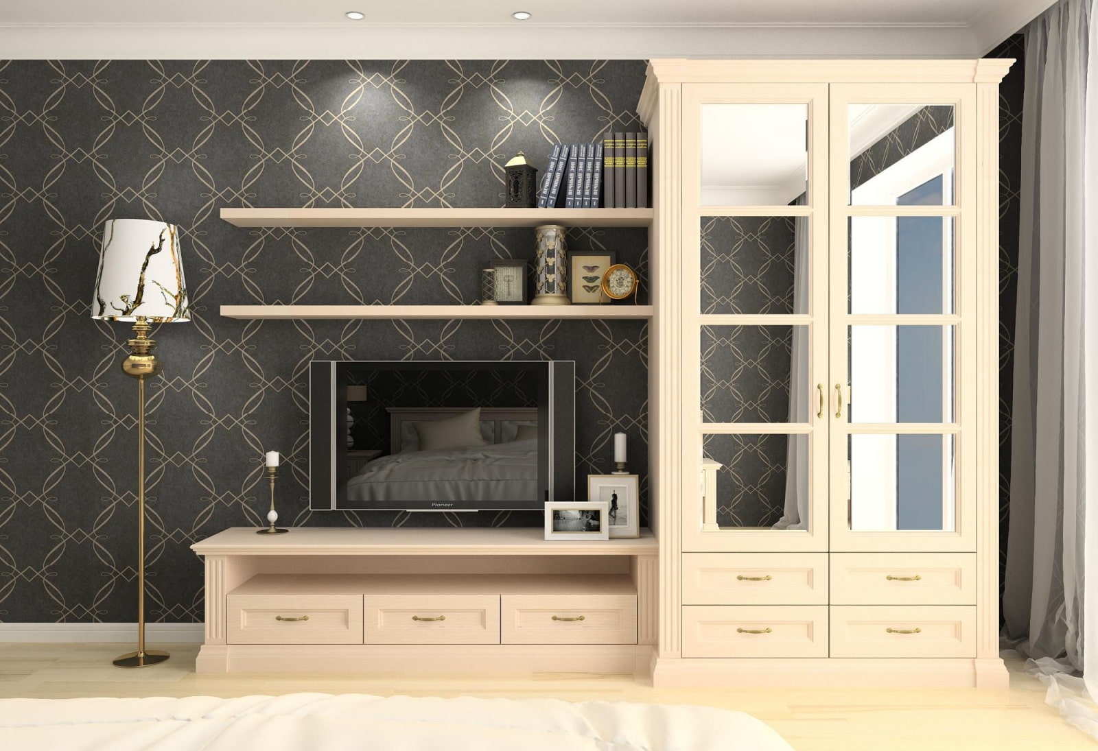 Fotoğrafta beyazdan yapılmış mobilya duvarlı bir oturma odası var.