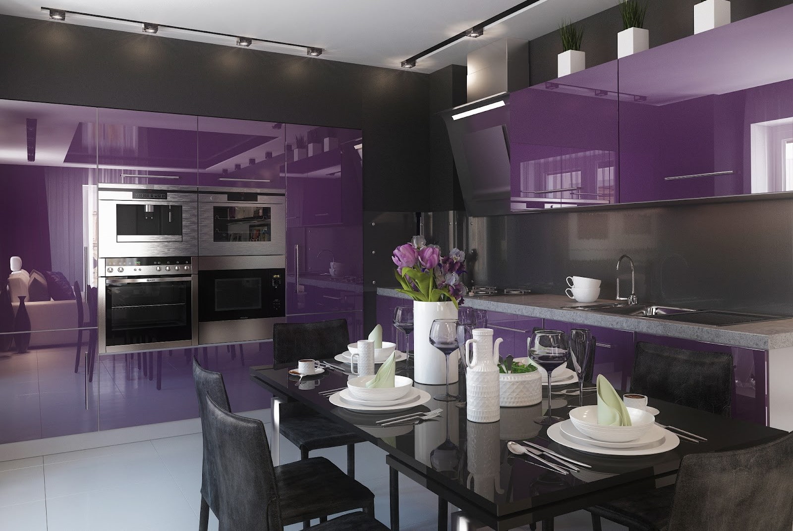 Parlak siyah parlak veya mat yüzeylerle birleştirilen yaban mersini veya menekşe tonu, geniş bir mutfağın içini yüksek kaliteli aydınlatma ile mükemmel bir şekilde tamamlayacaktır.