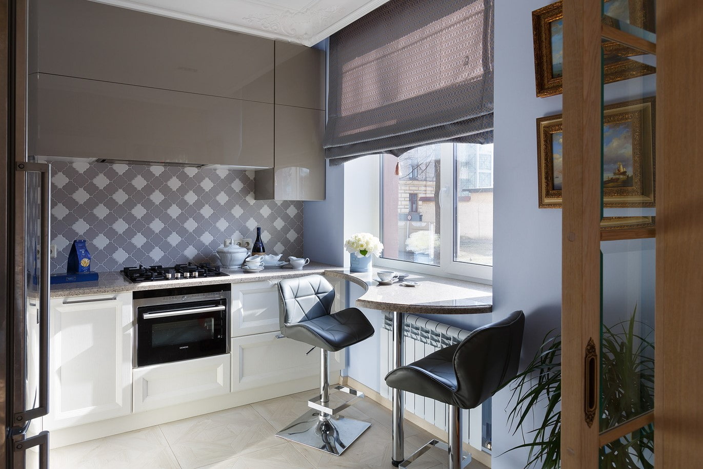 Küçük bir mutfak için, hafif mobilya cepheleri ile birlikte sessiz renklerde bir ayna veya parlak önlük seçilmiştir. Bu, atmosfere biraz bütünlük verecektir.