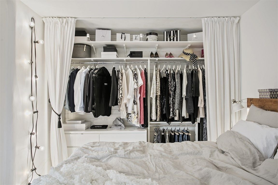 Bir sundurma veya balkonda bir giyinme odası düzenleyerek bir odada metrekare tasarrufu sağlayabilirsiniz.