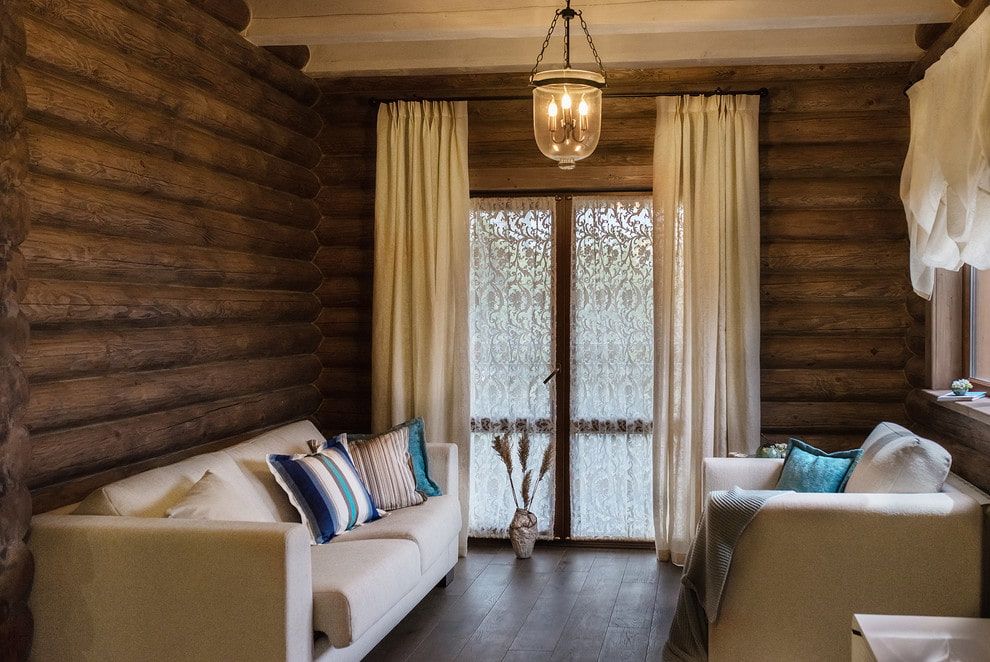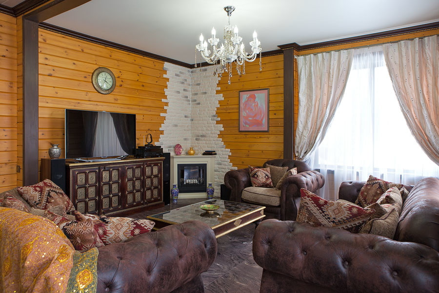 Une salle dans une maison privée dans un village est simplement créée pour un style rustique ou un style campagnard. Les murs en bois durable ou en rondins sont les principaux éléments caractéristiques. Pour renforcer l'effet, le mobilier est complété par des coffres en bois, des étagères simples, des étagères ouvertes et des accessoires intéressants.